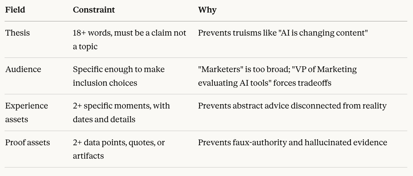 - Write a brief before your next AI draft. Thesis, two experience assets, two proof assets. If you can't fill it out with real material, you don't have a post yet — and any draft you generate will need rescue, not refinement.