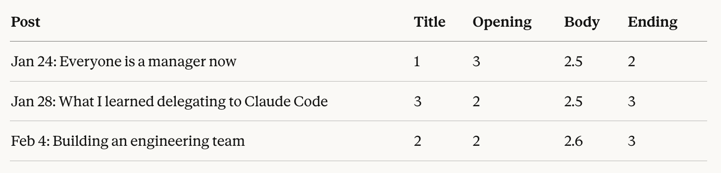 In the meantime, I track edit intensity on a 0–3 scale for each section of every post: 0 means unchanged from the AI draft, 1 means light edits, 2 means significant revision, 3 means rewritten entirely.